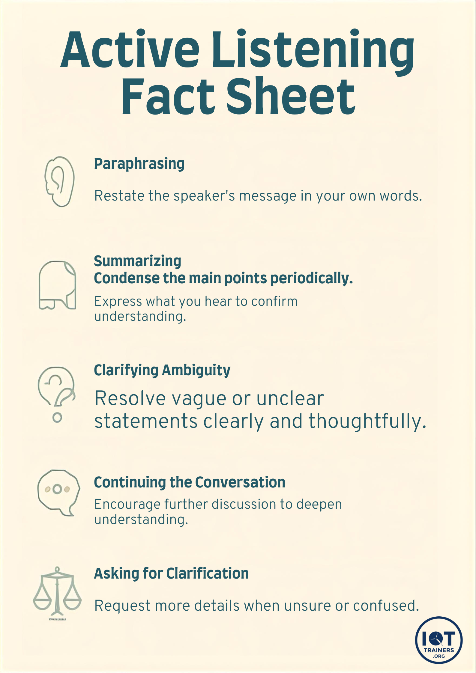 - Paraphrasing – Repeat what the other person said in your own words to confirm you understood correctly.